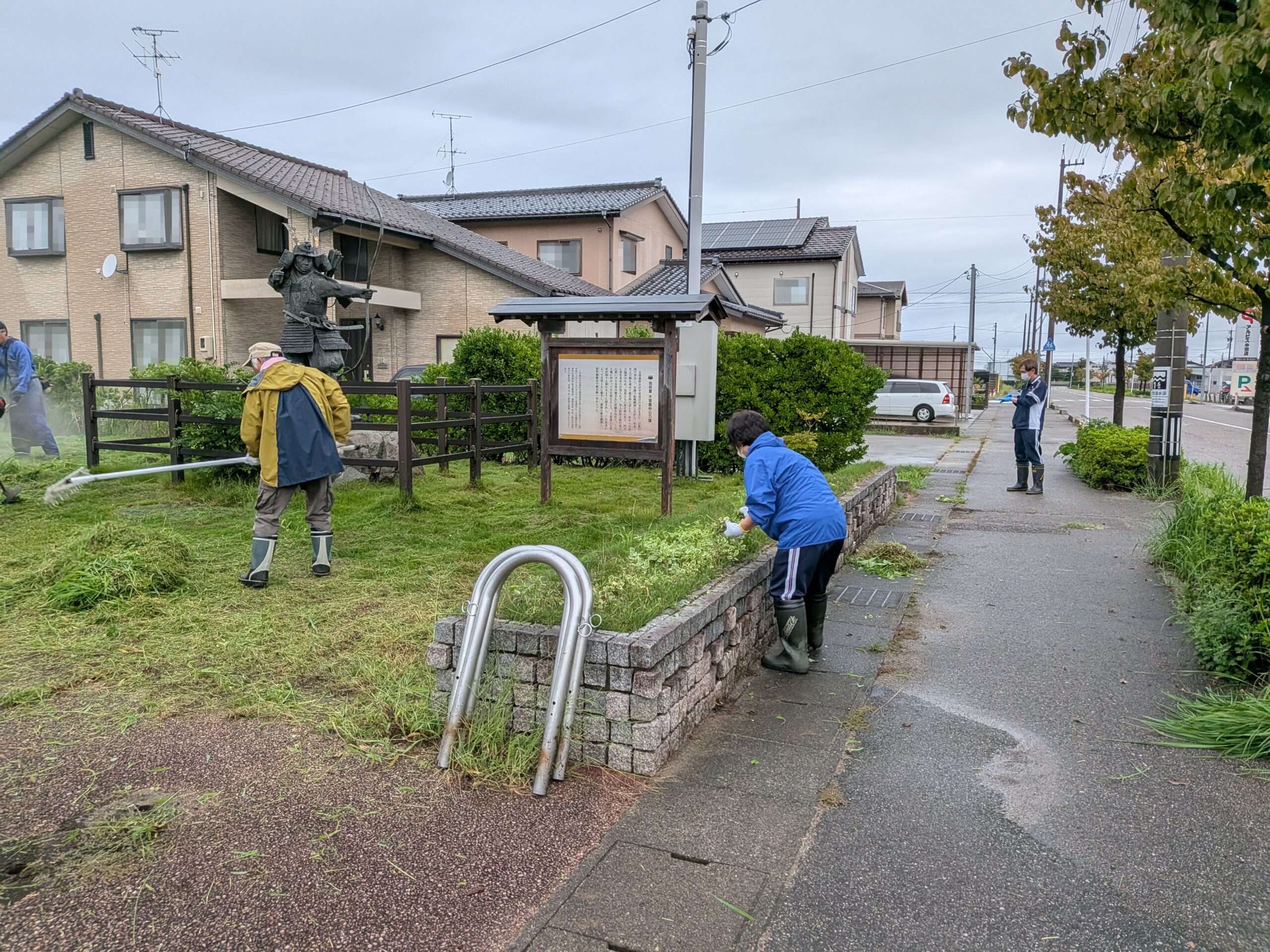 週末の「中田かかし祭」を控えて、地域のみなさま総出で綺麗に草を刈られました。私たちはみなさまが刈られた草を集めて袋に詰めたり、刈払機の入らない箇所の草むしりで協力させていただきました。