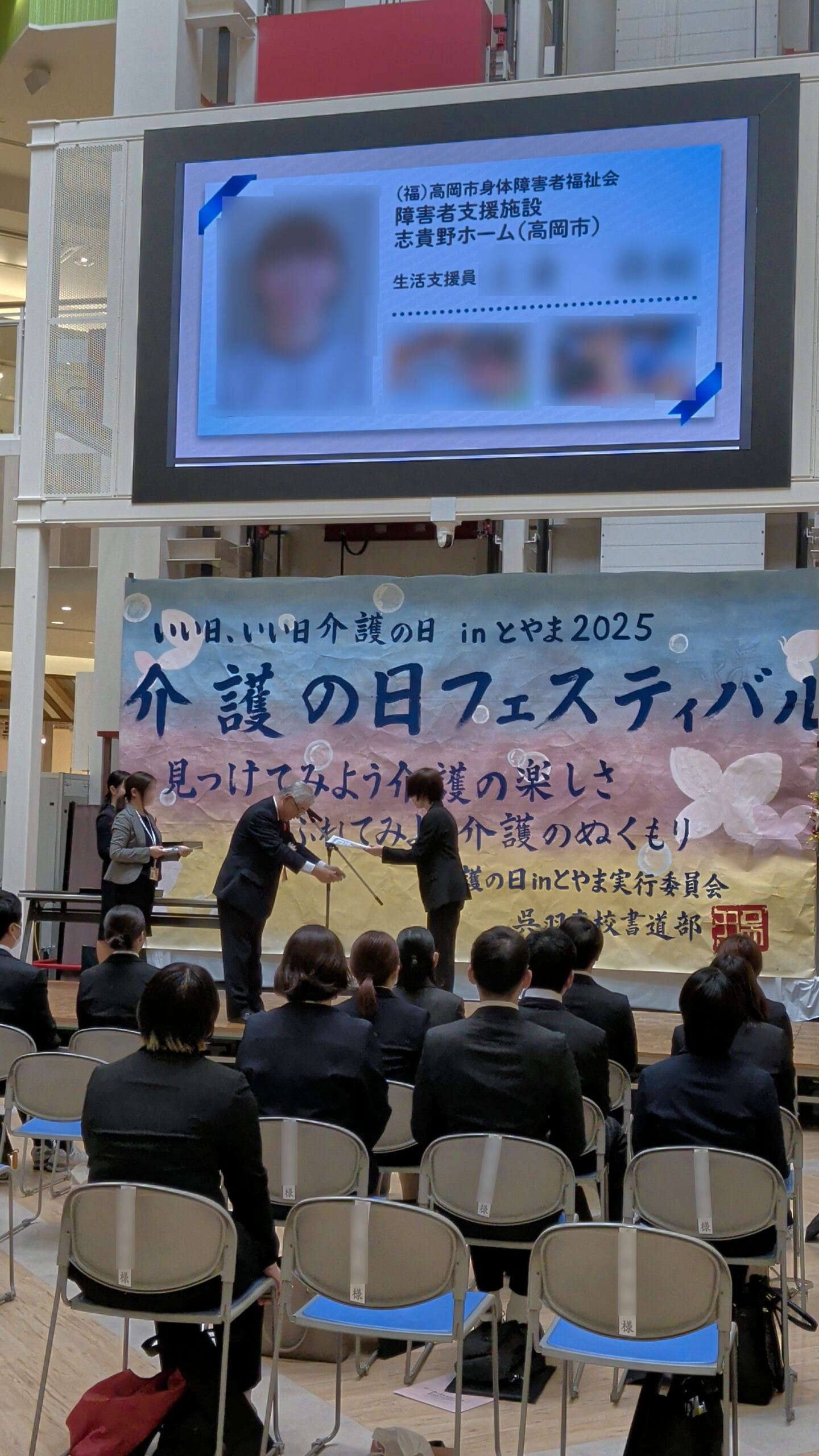 11月3日(月・祝)に富山市のフューチャーシティ・ファボーレで開催された「いい日、いい日 介護の日 in とやま 2025 介護の日フェスティバル」において、県内の介護、福祉事業所に勤務する職員を表彰する「がんばる介護職員表彰式」があり、当法人から障害者支援施設 志貴野ホームのT生活支援員が受彰されました。