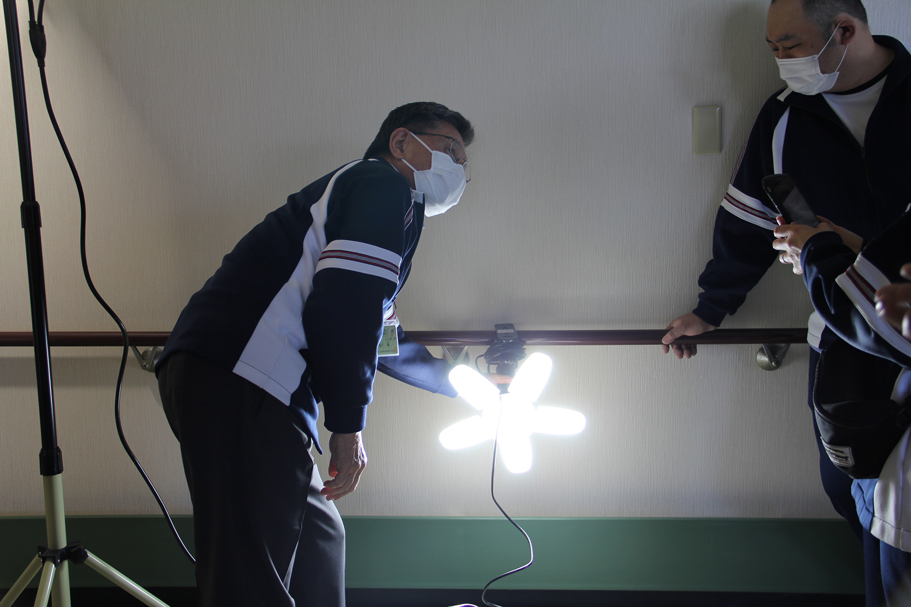男性職員で何度か試運転は行っているものの、有事の際に誰もが使用方法を理解し稼働できなければ意味をもたないため、今年度の自然災害BCP訓練および所内研修会として、保管場所や発電機の操作方法を学び、館内のどこに投光器とテープライトを設置すればベストであるのかという点についても検討を行いました。